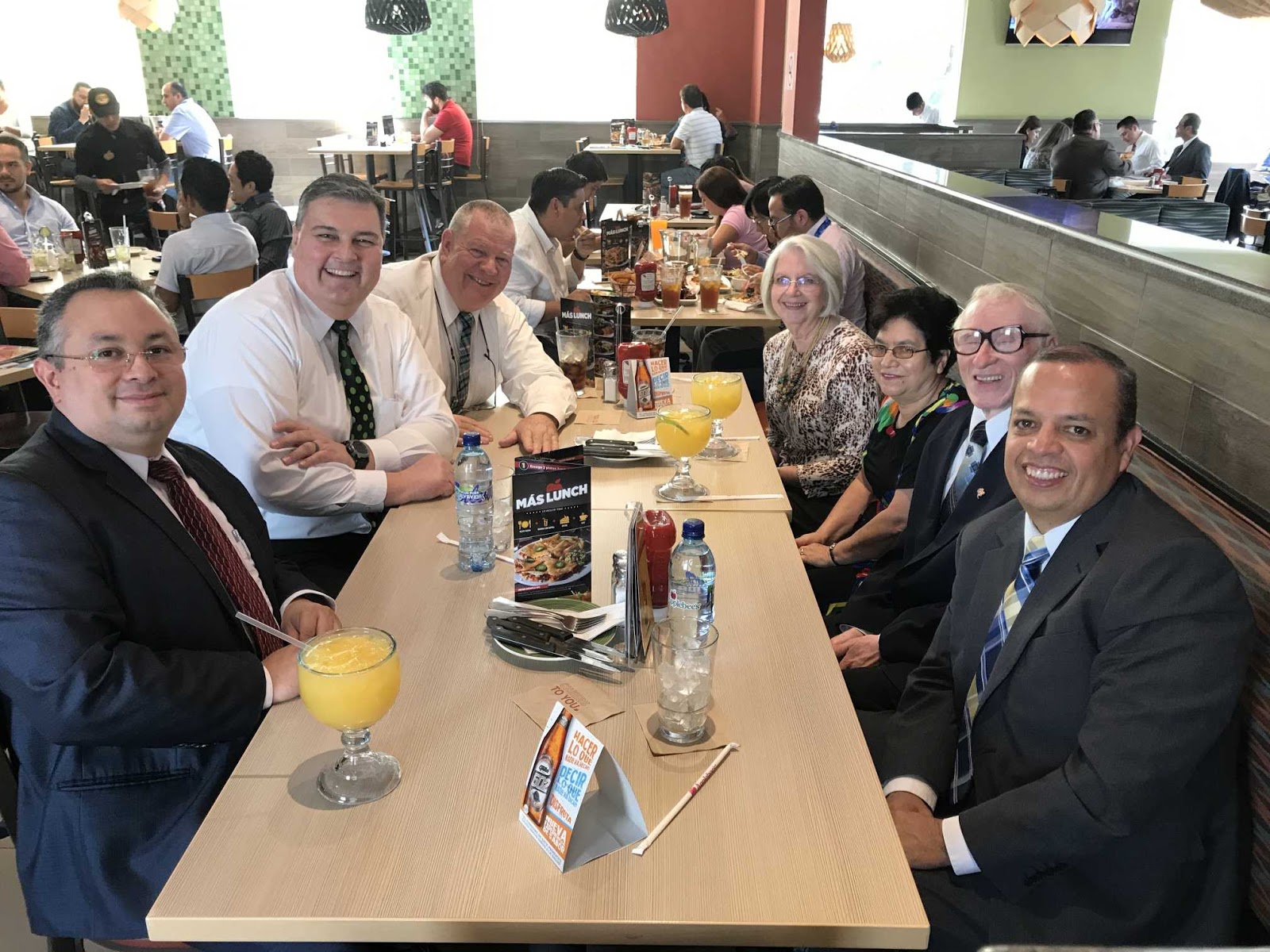 | Lunch at Applebees on Friday. L to R, Brother Jaime Carranza, assistant temple recorder, Brother Robert Simmons, Area Manager for the temple department, me, mom, Sister Funes, assistant to the matron, President Funes, 2nd counselor in the temple presidency, and Brother Oscar Abadillo, temple recorder. |