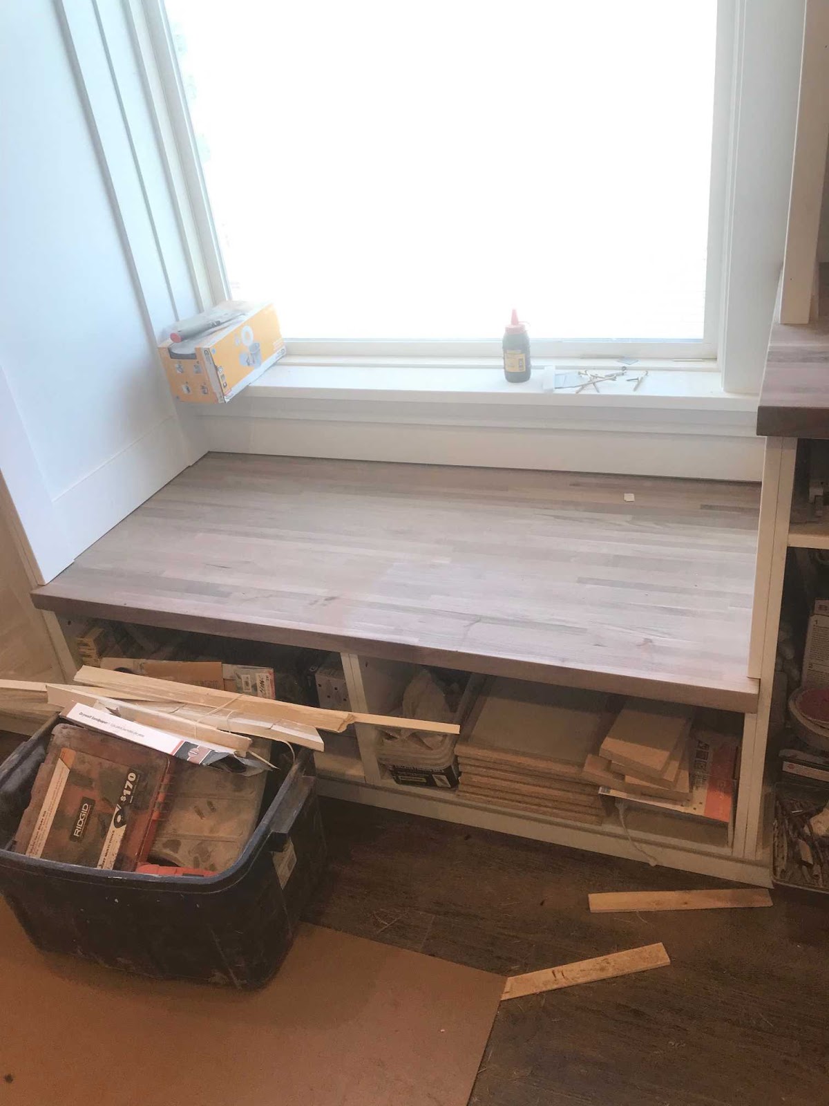 | Drawers under the benches built and installed and the drawer fronts cut down from doors. |