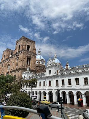 Tuesday: We had our weekly meeting and found out that we would not have access to the temple for ordinance worker training for 4 weeks. We asked President Aguirre if we could take advantage of the closure to visit Cuenca, a city in southern Ecuador where I had served 51 years ago as a young missionary. He agreed and so we left late that afternoon. The flight is only an hour and we arrived in Cuenca about 5:00pm. We took the public transportation train into the old part of Cuenca. We only had one small roller bag and my backpack. We wandered around trying to find our Airbnb for about an hour. We would ask someone which way to the street we needed and we would walk in that direction a few blocks and then we would ask another person and they would tell us a different direction. Finally, I put the address in Waze and we got there. I felt really old for not thinking of that sooner. For me, the best part of the Airbnd was the patio that looked out over the roof tops. For mom, the worst part of the Airbnb was the 3 flights of stairs to get to the apartment. We went out to dinner and bought some food for the fridge.The were some amazing cloud formations on the flight down to Cuenca. I think this is Cotapaxi under these clouds.